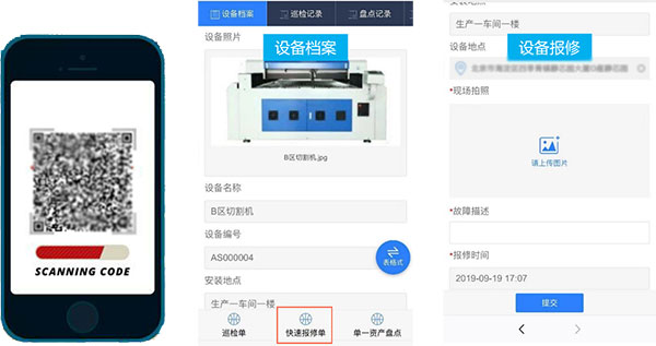 设备维护:在操作人员进行日常设备巡检时,如发现设备出现异常,可使用移动端扫码,快速申请设备报修。