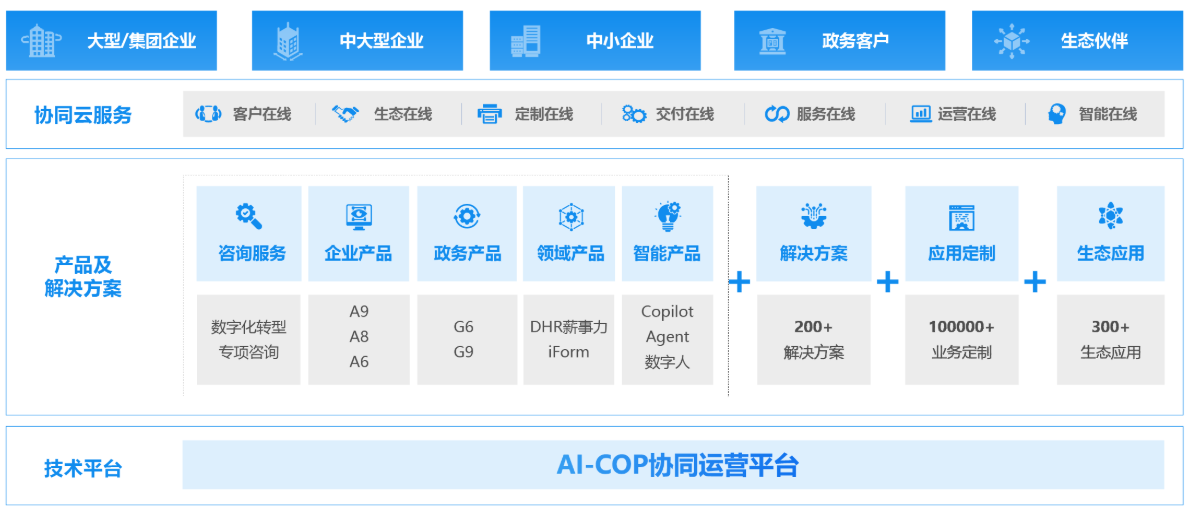依托COP中台能力,整合BPM流程引擎、组织引擎、移动引擎、数据与AI引擎,提供表单与页面建模、低代码开发等功能。通过流程整合、数据同步共享与集成连接能力,实现轻重应用区隔与场景闭环,支撑个性化业务定制与系统灵活扩展。