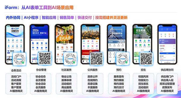 此次升级的iForm2.0更深度结合业务痛点,推出七大核心场景解决方案,快速搭建个性化AI小程序。凭借快捷交付、灵活定制、高性价比优势,打通组织内外协同与业务闭环,深度适配制造、医疗、教育、政务等多行业需求。