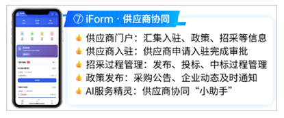面向制造、建筑、商贸等高频采购企业,iForm2.0可实现供应商门户集成,实现供应商入驻、招采信息发布、投标中标,深度集成AI-COP平台,解决内外数据不通、流程不透明等问题,保障招采阳光合规、降本增效。