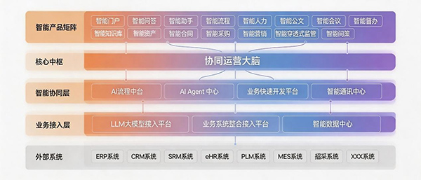 从实践角度看,企业真正需要建设的,不再只是传统意义上的“协同平台”,而是面向经营与管理全局的“智能运营中枢”。它不是替代原有业务系统,而是站在原有系统之上,把分散的流程、数据、规则、任务和角色连接起来,形成一个能够支撑组织感知、分析、协同和运营优化的中心能力层。它既服务于高层对经营状态的穿透认知,也服务于中层对流程执行和跨部门协作的管理,更服务于一线员工在具体工作中得到更及时的指引、支持与反馈。
